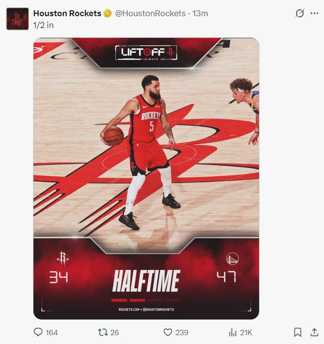 北京时间4月21日,NBA季后赛,勇士队客场以95-82击败火箭,大比分1-0领先。首节火箭领先3分,第二节火箭13-29崩盘被反超13分之多,第三节火箭一度落后23分但三节打完缩小到9分,末节火箭一度缩小到4分出现了两个失误再度被拉开,比赛完结。