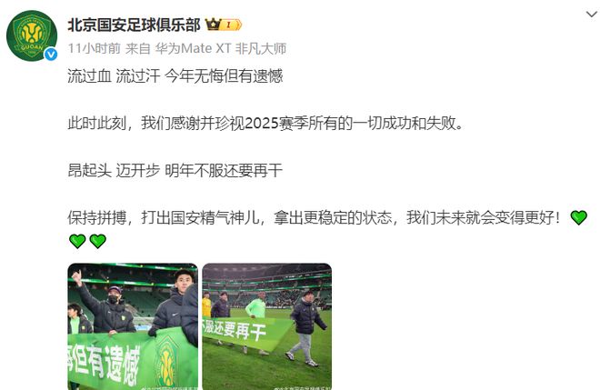 赛后,国安球员拉出两张横幅,第一张上面写着:“流过血 流过汗 今年无悔但有遗憾”。第二张印着:“昂起头 迈开步 明年不服还要再干”。俱乐部官微上还打出一句话:“保持拼搏,打出国安精气神儿,拿出更稳定的状态,我们未来就会变得更好!